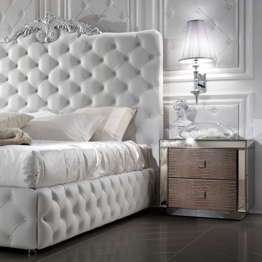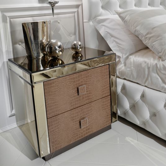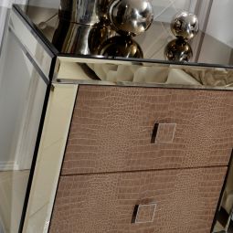 Shown here in the finest venetian bronze 4 mm bevelled mirrored finish together with the two drawers in a luxurious alligator pattern embossed leather with matching square chrome handles enhanced by defined detailed stitching.