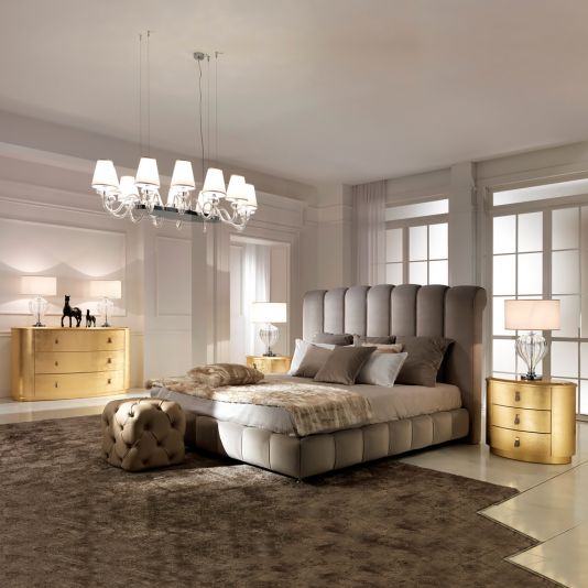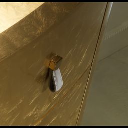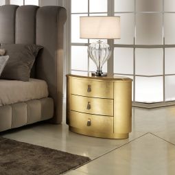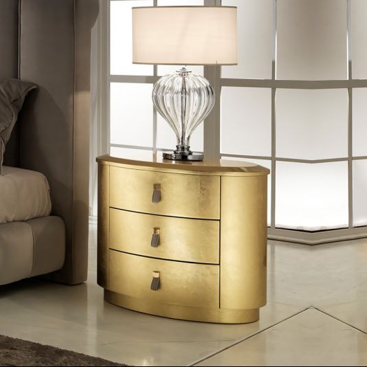 Luxury Italian Oval Gold Bedside Chest. This luxurious three drawer bedside cabinet is made by master Italian furniture makers and has an integrated soft close bluemotion system for effortless closing. Its beautifully curved shape and gold leaf finish offer unmistakable luxury. Made to the highest standards this cabinet is available with the option to order in any RAL classic high gloss or matt colour, and also silver or champagne leaf