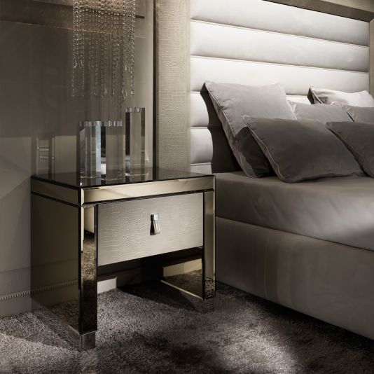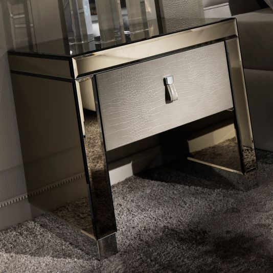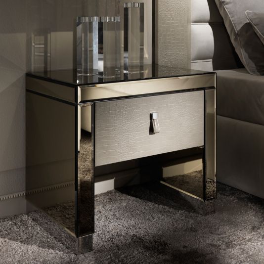 The Modern Mirrored Alligator Embossed Leather Bedside Table with drawer is the most stunning piece of contemporary design. Truly versatile. Use as a bedside table, modern side table or as a welcome in any hallway. Adding contemporary style and sophistication to any setting. Shown here in the finest venetian bronze 4 mm bevelled mirrored finish together with a luxurious beige alligator embossed leather upholstered drawer with matching pull drawer handle all nestled on modern stainless steel plinth style feet. The drawer has an integrated soft close bluemotion system for effortless closing. Height 57 cm x width 60 cm x depth 46 cm.