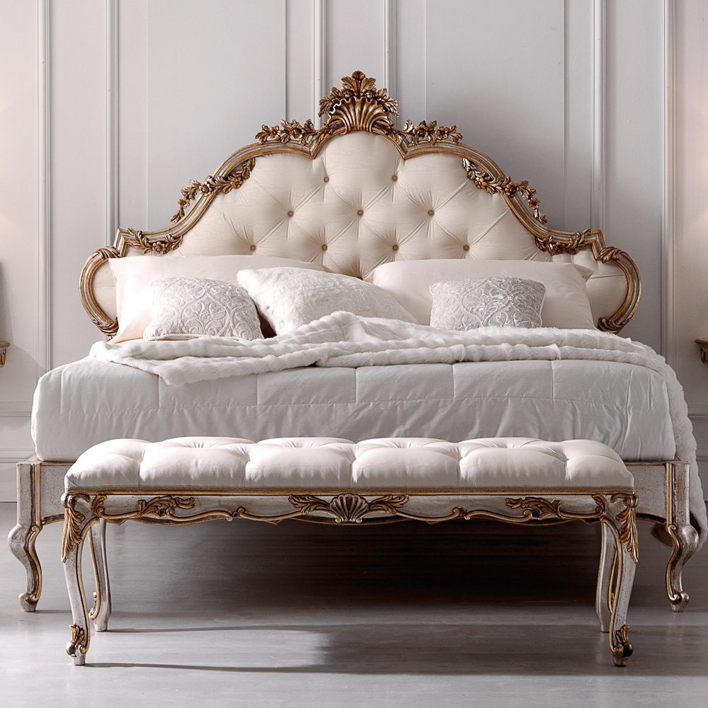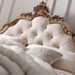The Opulent Rococo Button Upholstered Bed is a beautiful addition to any bedroom, shown here in oyster silk button upholstery with an antiqued silver finish with accents of gold and champagne to the ornate carved frame