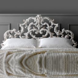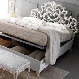 The Ornate Rococo Reproduction Italian Storage Bed is a beautiful addition to any interior. Sophisticated style enhanced by intertwined classic-style leaves, above all hiding all the practicality of a storage bed. Shown here in antique white and champagne silver finish to the luxurious statement ornate carved headboard.