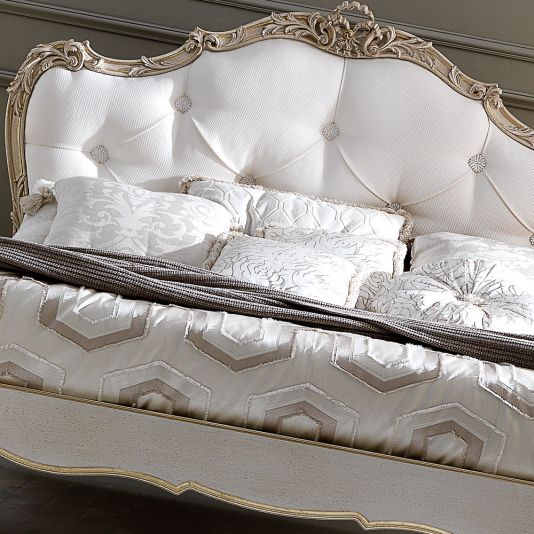 The Ornate Carved Italian Rococo Button Upholstered Bed is a beautiful addition to any bedroom. Above all adding glamour to any setting. Truly divine. Shown here in an antiqued ivory finish together with hand painted gold detailing to the ornate carved frame. Completed in a fresh white textured fabric button upholstery and statement striking button detailing