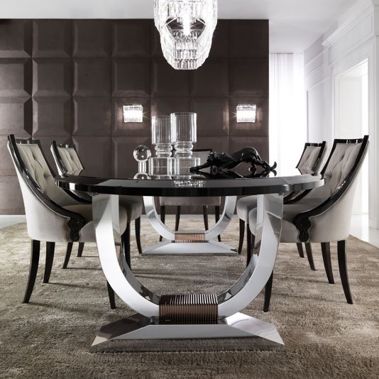 Each elegant dining chair with scroll detail is finished in a matching high gloss black lacquered finish, button upholstered and padded to the highest standards in a soft grey fabric. Indulge and spoil your dinner guests with these supremely comfortable chairs affording long convivial dinner conversations.