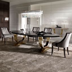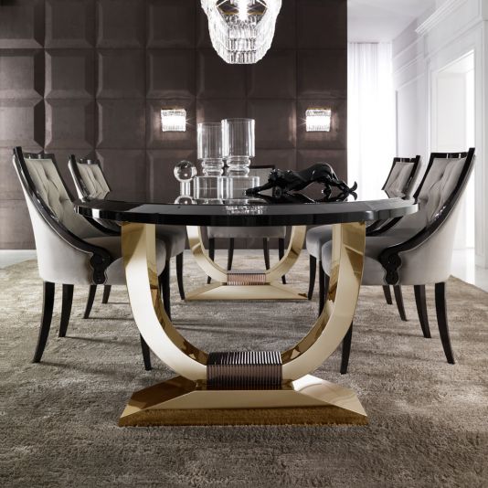 The Italian Black Lacquered Gold Oval Dining Table is perfect for intimate evening suppers. A gorgeous dining table that offers outstanding style and comfort providing the ultimate sophisticated dining experience indeed. A stylish contemporary table with a high gloss black lacquered top and supported by two striking polished stainless steel u shaped plinth style bases in a striking 24 carat gold finish.